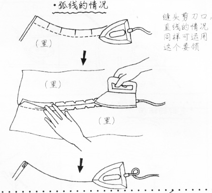 曲線較彎的時候可以在縫邊上打上幾個剪口,再劈開熨燙: