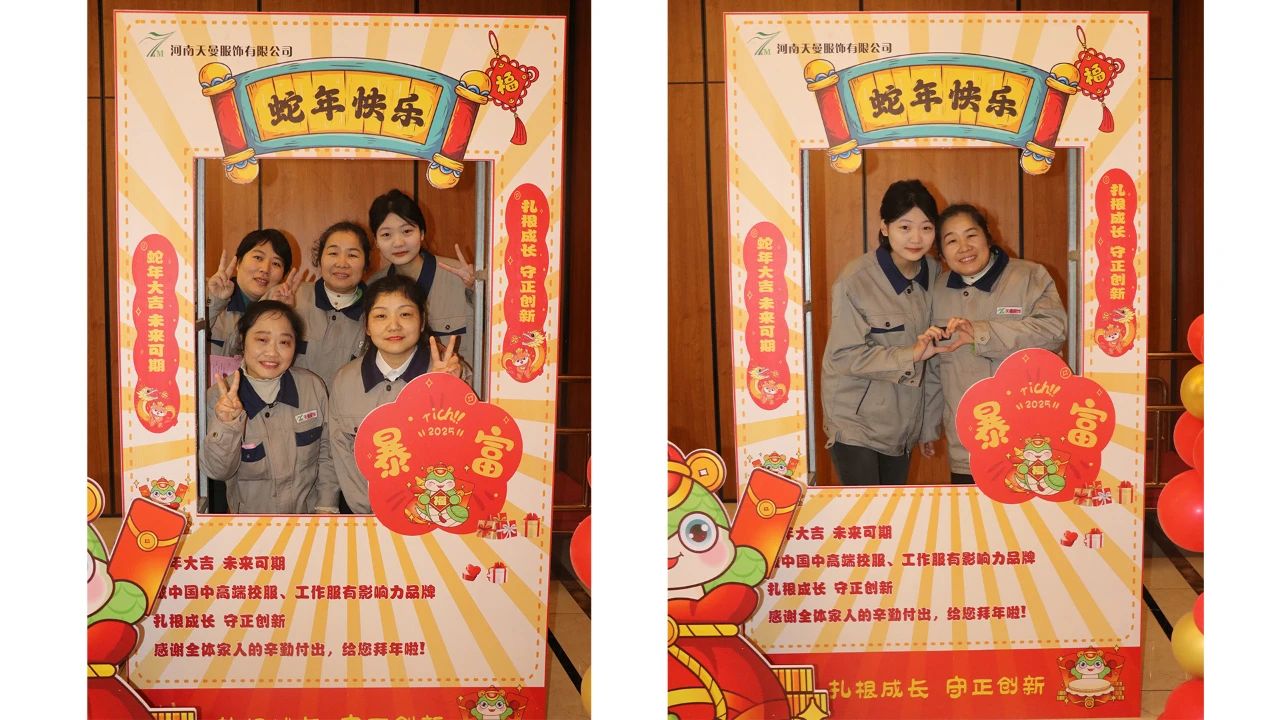 2025年元月23日上午,河南天曼服飾400多名員工歡聚一堂,歡快喜慶的年會現場張燈結彩,處處洋溢著天曼人的歡歌笑語,喜慶的吉祥門前大家紛紛拍照合影,相互祝福、相互問候,交流著一年的收獲喜悅。